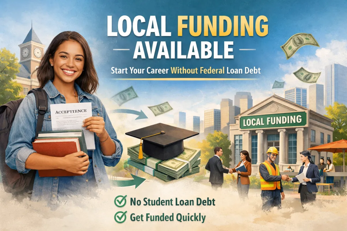 Students here avoid the heavy burden of federal loan debt. We connect you with local funding sources to get your career started faster
